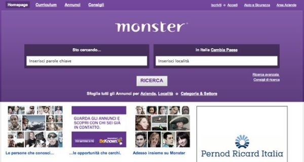Se vuoi cercare lavoro su Internet, uno dei primi siti che ti consiglio di visitare è Monster, una vera e propria istituzione in questo settore. Monster permette di rispondere in maniera classica agli annunci di lavoro pubblicati sulle sue pagine ma anche di caricare online il proprio curriculum vitae, in modo che le aziende in cerca di personale possano trovare velocemente lavoratori qualificati.