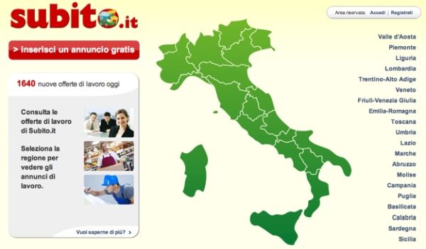 Un altro buon sito per cercare lavoro in Italia è Subito.it che permette di cercare offerte di impiego regione per regione in maniera molto pratica e veloce. Collegandoti alla sua pagina principale, troverai infatti una cartina dell'Italia dalla quale selezionare la regione in cui cercare lavoro. Una volta selezionata la tua regione di interesse, visualizzerai tutte le proposte di impiego presenti in quell'area.