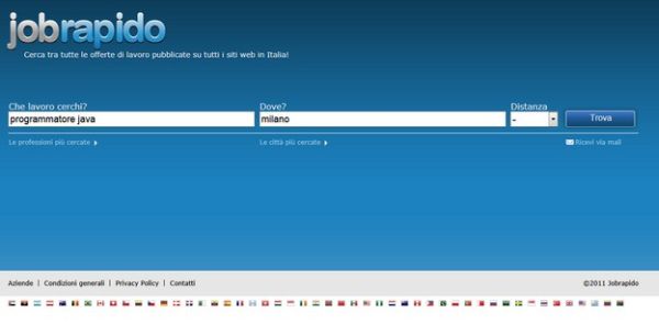 Un altro ottimo sito per cercare lavoro su Internet è Jobrapido. Il sito include annunci di lavoro di ogni genere provenienti da tutta Italia e si presenta come un motore di ricerca molto semplice da usare. Per trovare l'offerta che ti interessa, non devi far altro che digitare il tipo di impiego che cerchi nel campo Che lavoro cerchi?, la città in cui lo cerchi nel campo Dove? (c'è anche la possibilità di indicare la Distanza massima dalla città per il posto di lavoro) e cliccare sul pulsante Trova.