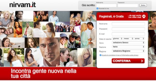 Quindi, se sei interessato a chattare gratis su Nirvam e se non hai ancora provveduto a creare un tuo profilo sul famoso sito di incontri la prima cosa che devi fare è quella di cliccare qui in modo tale da poterti subito collegare alla pagina Web principale dello stesso. Successivamente compila il modulo di iscrizione che ti viene mostrato a schermo. Digita dunque il nickname che intendi usare in chat nel campo collocato accanto alla voce Nickname, digita la password che desideri associare al tuo account che stai per creare sul sito di incontri immettendo nel campo Password, digita il tuo indirizzo di posta elettronica nel campo presente accanto alla voce E-mail e fornisce le altre informazioni a te relative utilizzando i menu a tendina presenti accanto alle voci Data di nascita, Sono, Nazione, Regione e Località. Per concludere pigia sul bottone rosso Conferma.