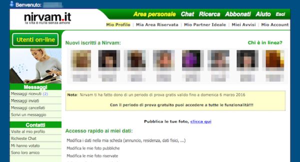 A questo punto direi che ci siamo, puoi finalmente cominciare a chattare gratis su Nirvam sfruttando in maniera completa tutte le funzioni del sito di incontri. A testimonianza di ciò una volta visualizzata la pagina Web principale del sito di incontri visibile dopo il login dovresti visualizzare l'avviso Nota: Nirvam ti ha fatto un dono odi un periodo di prova gratis valido fino giorno mese anno (al posto di giorno mese anno trovi indicata la data di scadenza del tuo periodo di prova gratis). L'avviso ti verrà mostrato ogni qual volta effettui l'accesso a Nirvam, nella pagina principale del sito di incontri.