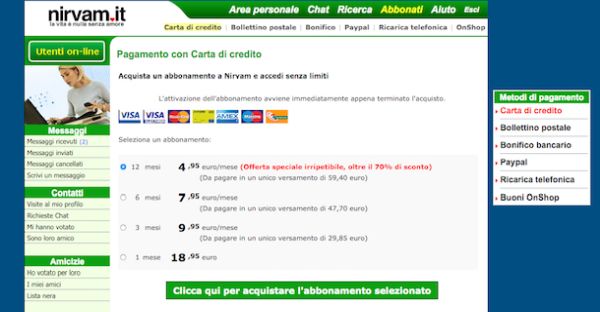 Se non c'è alcun avviso o se ne è presente uno indicante il fatto che il periodo di prova del servizio è scaduto non potrai più chattare gratis su Nirvam. In tal caso per continuare a fare nuove conoscenze sul sito dovrai necessariamente sottoscrivere un abbonamento a pagamento effettuando l'accesso alla sezione Abbonati e scegliendo poi l'abbonamento desiderato e il metodo di pagamento preferito.