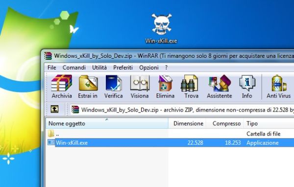 A download completato apri, facendo doppio click su di esso, l'archivio appena scaricato (Windows_xKill_by_Solo_Dev.zip), estraine il contenuto in una cartella qualsiasi e avvia il programma Win-xKill.exe per far entrare in funzione xKill.