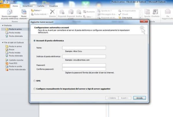 Qualora Outlook non riuscisse a collegarsi ai server del tuo account di posta elettronica, prova ad eseguire una configurazione manuale mettendo il segno di spunta accanto alla voce Configura manualmente le impostazioni del server o tipi di server aggiuntivi e digitando gli indirizzi dei server e le porte da utilizzare negli appositi campi.