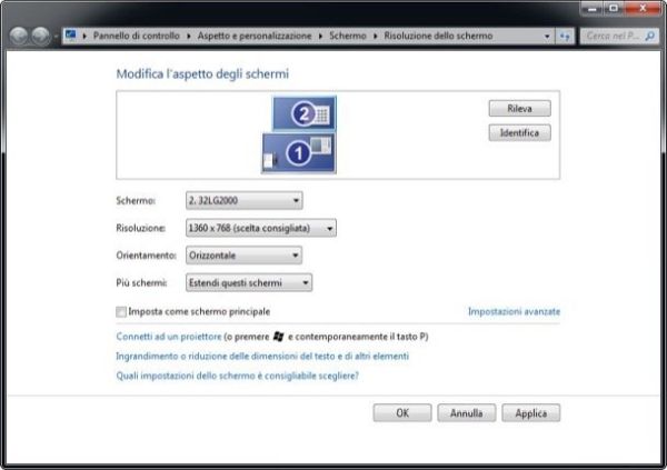 Nella finestra che si apre, utilizza il menu a tendina Più schermi per scegliere se estendere gli schermi (cioè se utilizzarli come due ambienti di lavoro separati) o se duplicare lo schermo del computer sul televisore; il menu Risoluzione per scegliere la risoluzione dell'uno o dell'altro monitor; il menu Orientamento per impostare il tipo di orientamento dello schermo (orizzontale e verticale) e pigia su Applica/OK per salvare i cambiamenti.