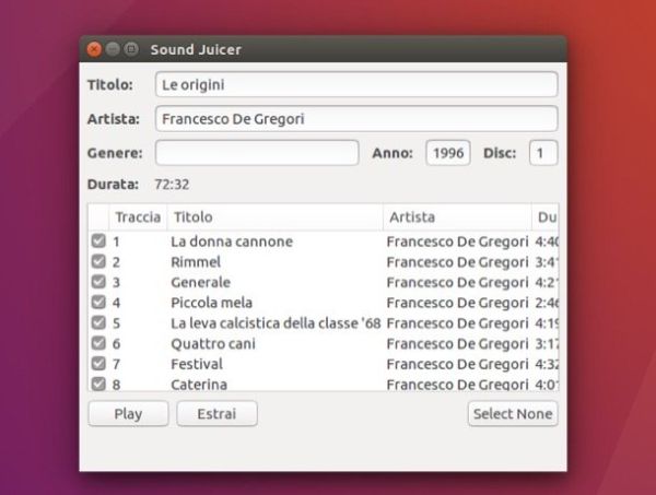 Adesso sei veramente pronto per passare all'azione! Avvia quindi Sound Juicer, imposta l'MP3 come formato di output seguendo le indicazioni che ti ho dato prima e seleziona tutte le tracce che desideri "rippare" mettendo il segno di spunta accanto ai loro titoli.