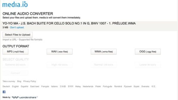Se vuoi provarlo, visita la sua pagina principale, pigia sul bottone Select files to upload e seleziona i file audio da convertire. Seleziona quindi il formato di output desiderato fra MP3, WAV, WMA ed OGG; la qualità dei brani finali fra 96, 128, 192 e 320 kbps e clicca sul pulsante Convert.
