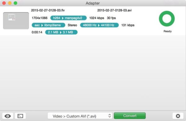 Quando sei pronto a trasformare i tuoi video FLV in AVI, trascinali nella finestra di Adapter, seleziona la voce Video > Custom AVI dal menu a tendina che si trova in basso e pigia sul bottone Convert. I filmati di output verranno salvati nella stessa cartella di quelli di origine mantenendo la loro medesima qualità e risoluzione.