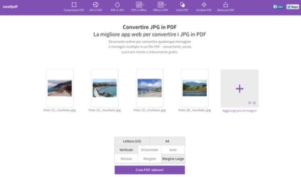 Il modo più semplice per trasformare una serie di immagini JPEG in un documento PDF è affidarsi a un servizio online come SmallPDF, il quale, tramite la sua interfaccia incredibilmente intuitiva (interamente tradotta in italiano, per giunta), consente di selezionare foto di qualsiasi dimensioni e peso, disporle nell'ordine che si preferisce e generare un documento PDF in formato A4 o Lettera (US) impostando dei margini e un orientamento (orizzontale o verticale) personalizzati.