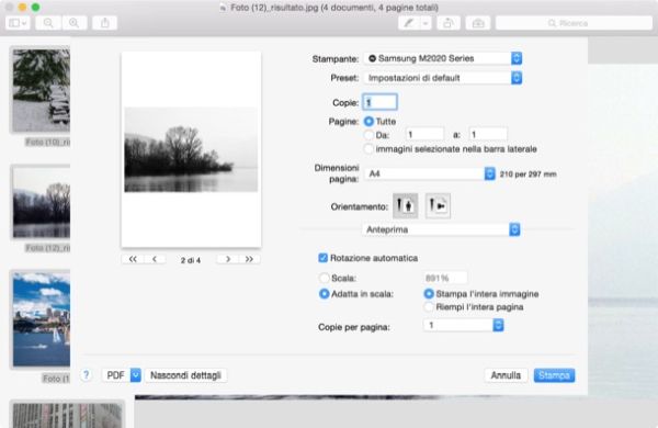 Successivamente, si devono disporre le foto nell'ordine che più si preferisce (usando semplicemente il mouse sulle loro miniature), selezionarle tutte premendo la combinazione di tasti cmd+a sulla tastiera del Mac e richiamare il comando File > Stampa dal menu in alto.