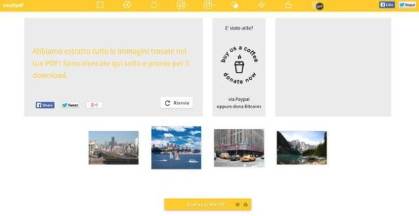 Attendi quindi che il PDF venga elaborato e scarica le foto estrapolate da quest'ultimo cliccando sulle loro miniature (per scaricarle singolarmente) oppure sul pulsante Scarica come ZIP (per prelevarle tutte contemporaneamente).