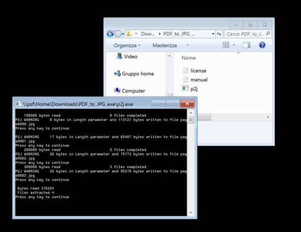 A download completato, apri l'archivio zip che contiene il software ed estraine il contenuto in una cartella qualsiasi. Prendi quindi il PDF dal quale vuoi estrapolare le immagini e trascinalo sull'icona del programma (p2j.exe).