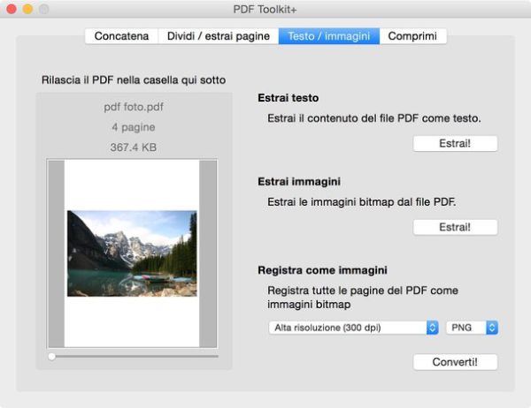 In ambito Mac, consiglio caldamente l'utilizzo di PDF Toolkit+. Si tratta di una piccola app che costa 1,99 euro e permette di modificare, creare e convertire PDF in tantissimi modi diversi. La puoi acquistare direttamente dal Mac App Store. Quanto al suo funzionamento non c'è molto da spiegare: trovi tutto quello di cui hai bisogno nella scheda Testo/Immagini del software.