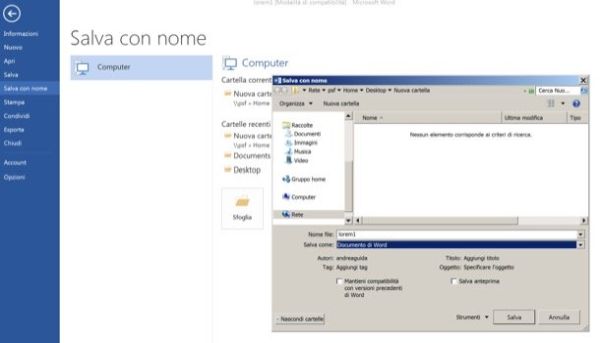 Visto? Semplice e “indolore”. Se utilizzi Office 2013 - mi raccomando - dopo aver cliccato su Salva con nome devi selezionare anche le voci Computer e Sfoglia dalla schermata che si apre. Altrimenti non comparirà la finestrella in cui scegliere formato e cartella di destinazione del documento da esportare.