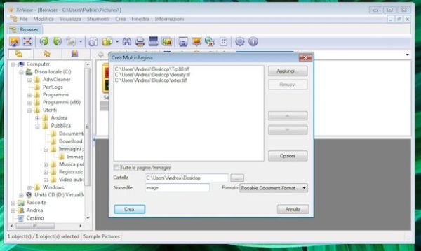 Ora sei davvero pronto per metterti all'opera! Recati quindi nel menu Crea > File Multi-pagina di XnView, cancella tutti i file elencati nella finestra che si apre (selezionandoli con il mouse e pigiando sul pulsante Rimuovi) e seleziona le immagini TIFF da convertire in PDF trascinandole. Puoi trascinarle direttamente nella finestra di XnView o cliccare sul pulsante Aggiungi e selezionarle “manualmente”.