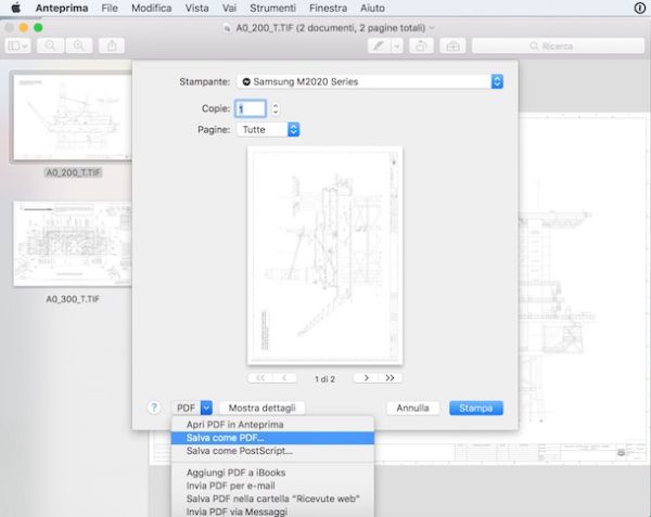 Per convertire file TIFF multi-pagina in PDF, stesso discorso: apri il documento, richiama il comando di stampa dal menu File e seleziona la voce Salva come PDF dal menu a tendina collocato in basso a sinistra nella finestra che si apre.