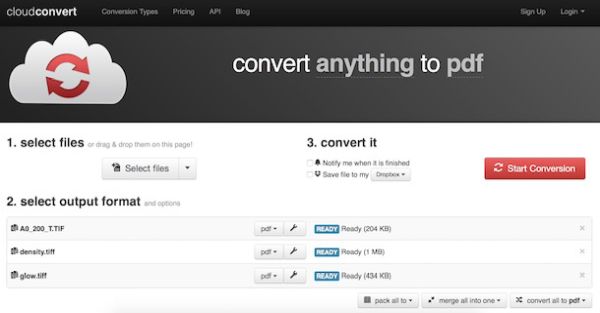 Per utilizzarlo, collegati alla pagina che ti ho linkato poc'anzi e trascina tutti i file TIFF da trasformare in PDF nella finestra del browser. Dopodiché disponili nell'ordine che preferisci (utilizzando il mouse), seleziona la voce pdf dal menu a tendina merge all into one collocato in basso a destra e clicca sul pulsante rosso Start conversion.