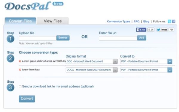 Se ti interessa capire che cosa bisogna fare per poter convertire un file Word in PDF direttamente online puoi sfruttare DocsPal. Questo servizio totalmente gratuito funziona in tutti i browser senza necessitare di plugin esterni e non richiede alcuna registrazione. Supporta tutti i principali formati di file di Office e consente di convertire fino a 5 documenti contemporaneamente (con un peso complessivo massimo di 50MB).