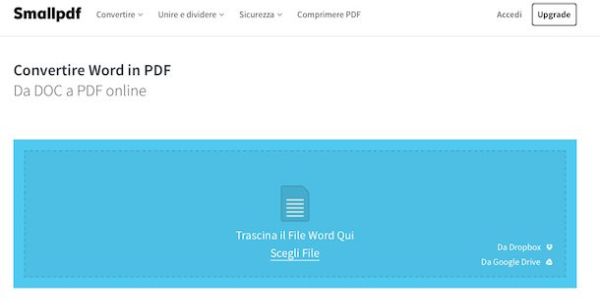 Come ti dicevo, un'altra ottima soluzione per convertire un file Word in PDF direttamente online è SmallPDF, una risorsa molto semplice da usare ed estremamente rapida nell'agire.
