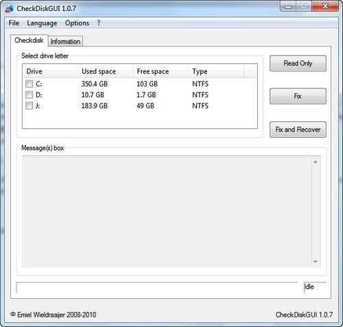 Nella finestra che si apre, puoi selezionare gli hard disk da controllare/riparare mettendo il segno di spunta accanto alle lettere relative alle loro unità (es. C:, J:, ecc.). Clicca quindi sul pulsante Read Only per verificare la presenza di errori sul disco e su Fix and Recover per riparare gli errori dell'hard disk e provare a recuperare i dati contenuti nei settori del disco danneggiati. L'opzione Fix ripara gli errori presenti sull'hard disk senza tentare il recupero dei dati.