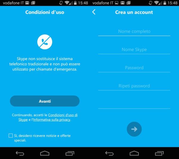 Bisogna quindi pigiare sul bottone Avanti (se presente, attenzione a non lasciare la spunta sulla voce Sì, desidero ricevere notizie e offerte speciali per non ricevere email promozionali) e compilare il modulo di registrazione con tutti i dati richiesti: nome reale, nome utente Skype e password per accedere al servizio.