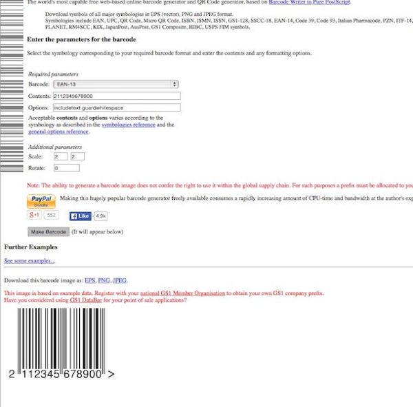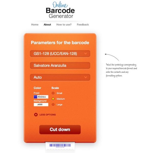 Tra i vari servizi online attualmente disponibili sulla piazza grazie ai quali è possibile creare codice a barre ti suggerisco di provare ad utilizzare Online Barcode Generator. Questo servizio permette, in forma del tutto gratuita, di creare dei codici a barre personalizzabili utilizzando svariate codifiche.