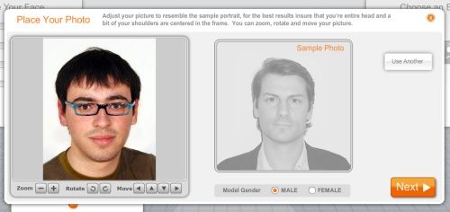 Al termine del caricamento della foto su PhotoFace, sistema la tua faccia nel primo riquadro, utilizzando gli strumenti a disposizione sotto la tua foto, e seleziona il tuo sesso in Model Gender (MALE, se sei un uomo; FEMALE, se sei una donna). Fai quindi click sul pulsante Next per proseguire: il tuo personaggio è stato creato!