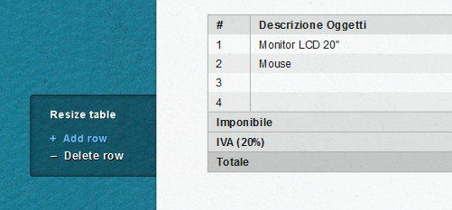 La tabella della fattura standard proposta da invoiceto.me è troppo lunga o troppo corta per le tue esigenze? No problem! Utilizzando le opzioni + Add Row e - Delete row collocate in fondo a sinistra puoi aggiungere o rimuovere nuove righe dalla tabella con un semplice click.