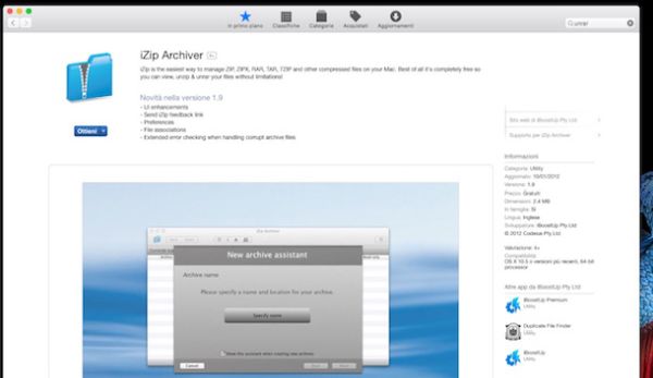 Se sei de parare che il funzionamento di Utility Compressione di OS X sia troppo, per così dire, blando e se sei quindi alla ricerca di una qualche risorsa un po' più elaborata grazie alla quale poter creare file ZIP ti invito a dare uno sguardo a iZip Archiver. Si tratta di un'applicazione gratuita disponibile su Mac App Store che consente di creare file ZIP e di aprirli senza doverli estrarre. L'applicazione consente di generare archivi compressi anche in altri formati.
