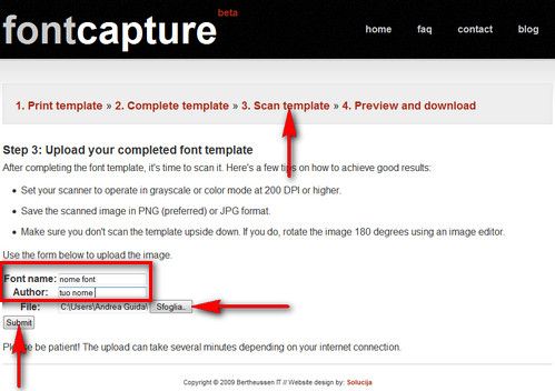 Ad operazione completata, torna su Fontcapture e clicca sulla voce 3.Scan Template (collocata nella parte alta della pagina). Nella pagina che si apre, digita il nome che vuoi assegnare al tuo font nel campo Font name, immetti il tuo nome nel campo Author, clicca sul pulsante Sfoglia..., seleziona il file JPG o PNG appena scansionato e fai click su Submit per caricare il tuo schema sul sito.