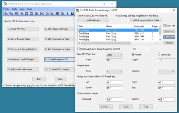 Quando sei pronto a convertire JPEG in PDF, avvia PDFill FREE PDF Tools e clicca sul bottone Convert images to PDF. Dopodiché trascina nella finestra che si apre tutte le foto che vuoi inserire nel tuo documento e riordinale utilizzando i pulsanti Move up (sposta su) e Move down (sposta giù), clicca sul pulsante Save as e scegli la cartella in cui esportare il PDF. Se il trascinamento dei file non funziona, clicca sul pulsante Add an image che si trova in alto a sinistra e seleziona "manualmente" le immagini da importare nel programma. In alternativa fai click sul bottone Add all images under a folder e seleziona una cartella per importare in PDFill FREE PDF Tools tutte le immagini contenuta in quest'ultima.