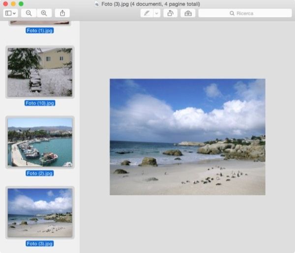 Nota: quando apri le immagini in Anteprima, queste dovrebbero essere raggruppate automaticamente nella stessa finestra. Qualora ciò non accadesse, sposta le loro miniature e trascinale tutte nella medesima finestra del programma.