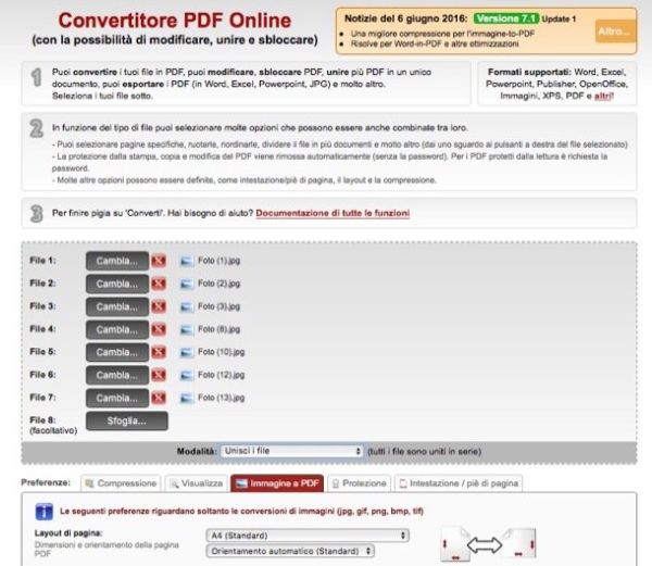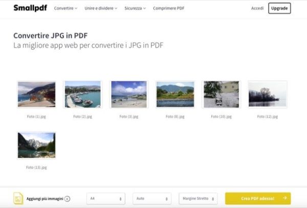 Per concludere, vorrei segnalarti alcuni ottimi servizi online che permettono di creare PDF da JPG senza installare alcun programma sul PC. Nessuno di essi richiede iscrizioni o autenticazioni social e la loro compatibilità è assicurata con tutti i browser più diffusi: Chrome, Internet Explorer, Safari ecc.