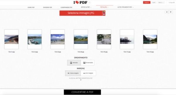 Per creare un documento con I Love PDF, collegati alla pagina iniziale del servizio e trascina le immagini che vuoi includere nel PDF al centro dello schermo. Dopodiché utilizza il mouse per disporre i file JPG nell'ordine che preferisci, scegli orientamento e margini delle pagine usando gli appositi pulsanti che si trovano in basso e clicca su Convertire a PDF per ottenere il documento di output.