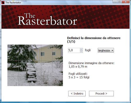 A questo punto, focalizza la tua attenzione sulla voce fogli, che indica il numero di fogli da stampare e da utilizzare per ricomporre il poster. Al variare del numero dei fogli, varia la dimensione del poster, che è indicata alla voce Dimensione immagine da ottenere. Non appena hai stabilito la dimensione del tuo poster, fai click sul pulsante Procedi.