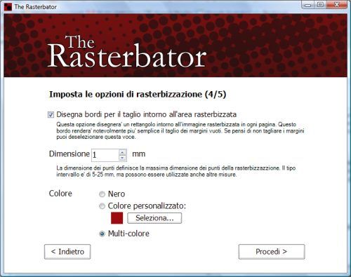 Stabilisci ora dove salvare il documento PDF da stampare contenente i vari pezzi del poster: fai click sul pulsante Seleziona..., apri la cartella in cui salvare il poster, fai click prima sul pulsante Salva e poi sul pulsante Rasterbizza!.