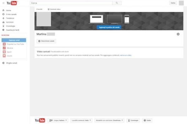 Missione compiuta! A questo punto hai finalmente un canale YouTube pronto ad accogliere i tuoi video. Prima di postare qualsiasi contenuto, ti suggerisco però di rendere un po' più accogliente la pagina aggiungendo una bella immagine di copertina e altre informazioni su di te.