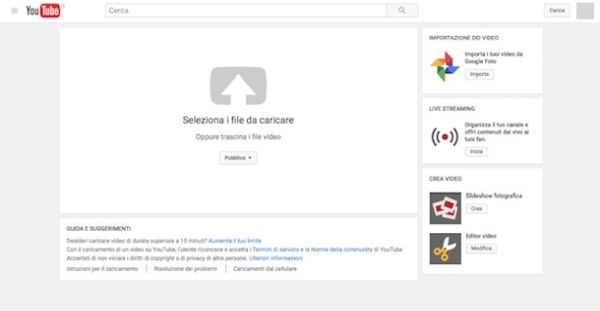 Perfetto! Direi che ci siamo. Ora hai un canale su YouTube, una descrizione che ti presenta al pubblico e dunque… beh, non c'è bisogno nemmeno di dirlo: clicca sul pulsante Carica che si trova in alto a destra, clicca sulla voce Seleziona i file da caricare ed attieniti alla semplice procedura guidata che ti viene mostrata a schermo per postare il tuo primo video. Eventualmente, puoi anche trasmettere una diretta streaming facendo clic sul pulsante Inizia che trovi a destra, in corrispondenza della sezione Live streaming.