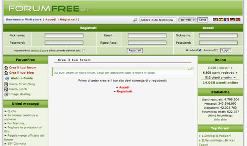 La prima cosa che devi fare per creare il tuo forum on-line è quella di collegarti al sito Internet di ForumFree. Nell'home page di ForumFree, fai click prima sulla voce Crea il tuo forum presente nella colonna di sinistra e poi sulla voce Registrati nella pagina Web che si apre.
