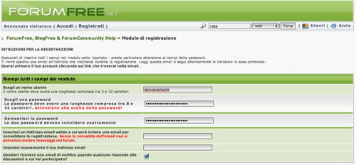 Nel modulo di registrazione che si apre, digita il nome utente che vorresti in Scegli un nome utente, la password per accedere a ForumFree nei due campi di testo Scegli una password/Reinserisci la password e il tuo indirizzo e-mail negli ultimi due campi di testo presenti.