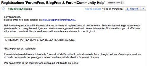 Dopo aver messo il segno di spunta alle tre voce Acconsento, fai click sul pulsante Accetto. Controlla la tua posta elettronica e apri l'e-mail ricevuta da ForumFree: devi fare click sul collegamento Web presente nell'e-mail per confermare la registrazione a ForumFree.