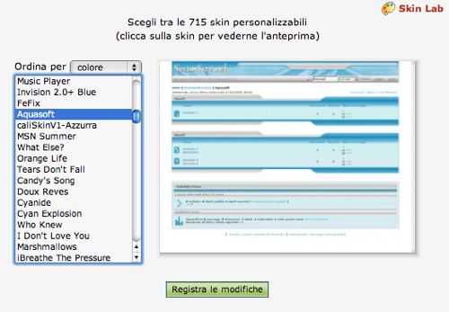 Il mio consiglio è quello di cambiare subito l'interfaccia grafica del forum creato. Per farlo, fai click sulla voce Modifica skin presente nella colonna di sinistra. Dopo aver selezionato una delle interfacce grafiche disponibili, fai click sul pulsante Registra le modifiche per applicarla al tuo forum.