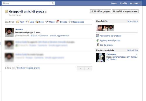 A procedura ultimata, sarai rimandato alla pagina principale del tuo gruppo: per interagire con gli amici che ne fanno parte, sfrutta gli strumenti collocati nella parte alta dello schermo. Clicca quindi su Post per scrivere un messaggio, su Foto per inserire una foto, su Video per pubblicare un video in bacheca, e così via.