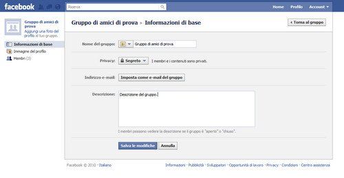 Per salvare i cambiamenti basta cliccare su Salva le modifiche, mentre per aggiungere nuovi amici al gruppo, devi selezionare la voce Membri (collocata a sinistra) e cliccare sulla voce Aggiungi amici al gruppo. Puoi anche aggiungere un'immagine rappresentativa del gruppo, cliccando prima su Immagine del profilo (sulla sinistra) e poi su Sfoglia.
