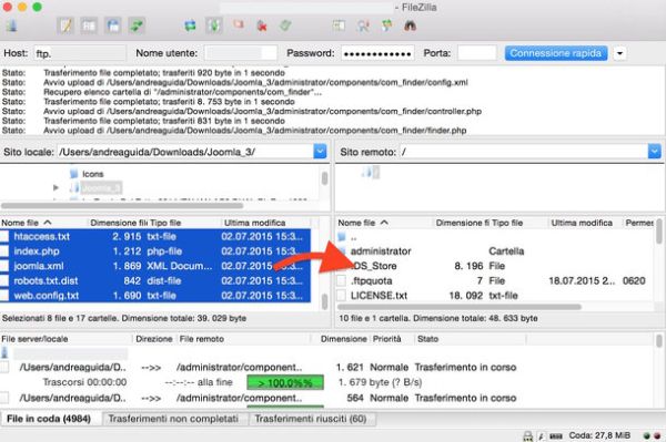 Una volta stabilita la connessione con il tuo spazio Web, cancella il file index.html presente in esso (non c'è sempre, ma se c'è va eliminato). Dopodiché seleziona tutti i file e tutte le cartelle contenute nell'archivio zip di Joomla che hai scaricato in precedenza (puoi estrarre i file dal pacchetto ZIP utilizzando qualsiasi software adatto allo scopo: 7-Zip, WinRAR ecc.) e trascinali nella cartella principale dello spazio Web.
