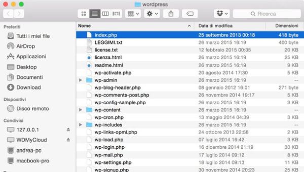 A scaricamento ultimato, apri il pacchetto zip con i file di WordPress ed estraine il contenuto in una cartella qualsiasi. Avvia quindi il tuo client FTP preferito (es. Filezilla), collegati al tuo spazio Web e copia nella sua directory principale tutti i file e le cartelle di WordPress (quelle che hai estratto dal pacchetto zip scaricato da WordPress.com) così come sono.