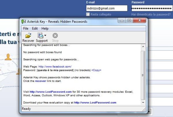 A questo punto, non ti rimane che aprire Internet Explorer ed accedere alla pagina Web contenente la password coperta dagli asterischi (con gli altri browser non funziona). Clicca quindi sul pulsante Recover di Asterisk Key e nel giro di pochissimi secondi dovresti riuscire a visualizzare la parola chiave nascosta.