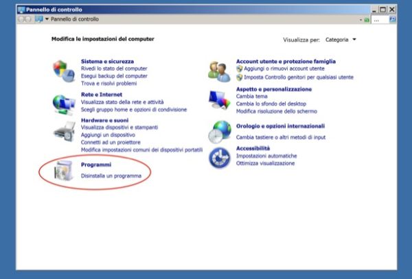 Apri il Pannello di controllo di Windows e clicca sulla voce Disinstalla un programma che si trova in basso a sinistra. Se non vedi questa dicitura, cerca il termine disinstalla nella barra di ricerca collocata in alto a destra e seleziona la voce Disinstalla un programma che compare fra i risultati della ricerca.