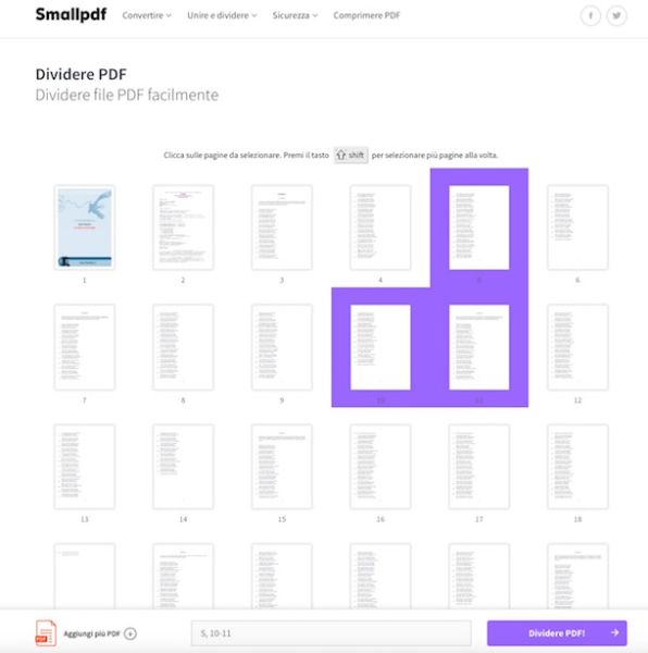 Attendi quindi qualche istante affinché ti vengano mostrate le miniature di tutte le pagine che compongono il documento dopodiché seleziona le pagine che è tua intenzione dividere dal PDF cliccandoci sopra con il tasto sinistro del mouse. Se hai la necessità di selezionare un determinato intervallo di pagine velocemente clicca sulla prima pagina di tuo interesse con il tasto sinistro del mouse, pigia il tasto shift sulla tastiera del computer e continuando a tenere premuto seleziona poi con il mouse l'ultima pagina del documento oche è tua intenzione estrapolare. Puoi controllare rapidamente tutte le pagine selezionate dando no sguardo alla numerazione annessa al modulo collocato in basso.
