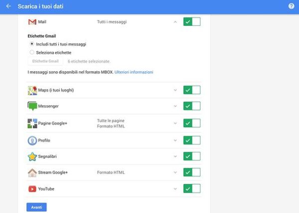 Prima di cancellare il tuo account Google o eliminare Gmail dalla lista degli strumenti attivi su quest'ultimo, ti consiglio vivamente di scaricare una copia di tutti i dati presenti su tutti i servizi dell'azienda di Mountain View che hai utilizzato fino ad oggi.